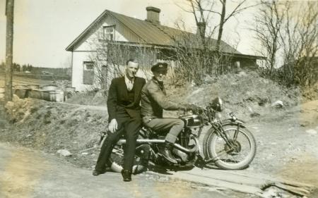 Holger Lundelin på motorcykeln till höger var sotare och bodde drygt 200 m mot Korkkulla gård från platsen för fotot och Lars (Lassu) Lindgren till vänster är son till den första stationskarlen på Tolls och bodde i Hindersby i villan som hans far hade byggt mellan Tolls station och Ljungheda. I bakgrunden är lanthandeln, Tolls butiken som handelsman F E Pihlström innehade före han blev bonde på Korkkulla gård. Enligt fotografiet är nu handelsman Carl Engblom innehavare av butiken. Carl Engblom återvände efter evakueringen 1956 och fortsatte som handelsman till slutet av 1960-talet.