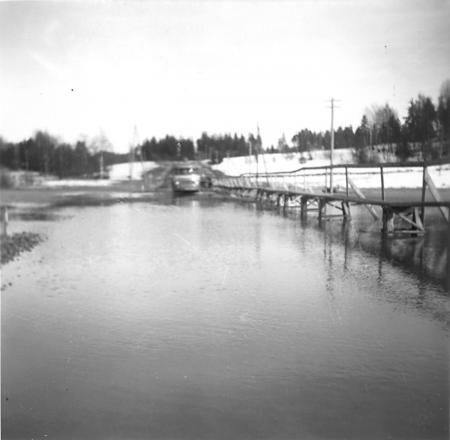 Översvämning vid Sundet i Nägels by sydost om Jorvas station på våren år 1958. T.h. en tillfällig gångbro för fotgängare.