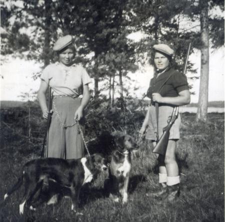 Hjördis Lönnberg till höger och hennes släkting Helena Helin till vänster samt jakthundarna Nelly och Mopsan,