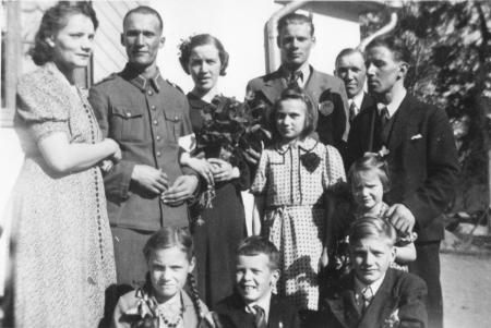 F.v. Hildings syster Dagmar Tuukkanen, Hilding och Etel Bergström, Hildings bror Karl Erik Bergström, Sigfrid Fagerström, Tuukkanen (Dagmars svåger). Barnen f.v. Doris och Guy Fagerström, Ingemaj Bergström (stående), längst t.h. sitter Nisse Bergström, bakom honom står en flicka Annikki Tuukkanen. Etel hade en mörkblå klänning av silla tyg. Då det var brist på varor och svårt att få tyg under kriget ville Etel ha en klänning som hon kunde ha nytta av också efter bröllopet. Då det unga paret gifte sig fick de köpkort för fyra lakan av folkförsörjningen.