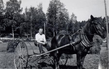 Friz Krone räfsar hö på Jolkby gårds Sjukhusåker.