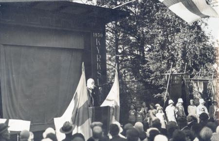 Festtalare J.E. Rosberg på Festberget i Jolkby då Kyrkslätts kommun firar 600 år.