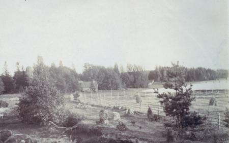 Vy mot kvarnen och bastun på Medvast gård.
