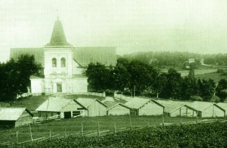 Kyrkslätts kyrka i början av 1900-talet. Jolkby gård till höger i bakgrunden.