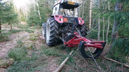 Korkkulla gårds Case International traktorn är redo för skogsbruk en snöfattig vinter i början av februari.