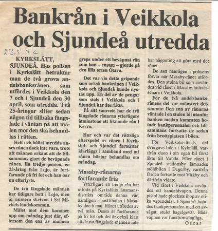Ingår i Kyrkslätts lokalarkiv Arkivalia Andelsbanken i Veikkola rånades den 7.4.1992 och i Sjundeå rånades andelsbanken den 30.4.1992. Två misstänkta sitter fängslade i väntan på rättegång. I Masaby rånades postfilialen den 6 .5.1992 av två män som ännu är på fri fot.
