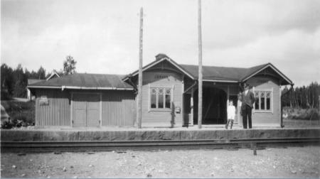 På bilden Jorvas station med tillbyggnad, troligen i början av 1930-talet. Den vuxna personen på bilden är möjligen Fridolf Sandström. Donator: Gretel Lundell (f. Sandström 1916).