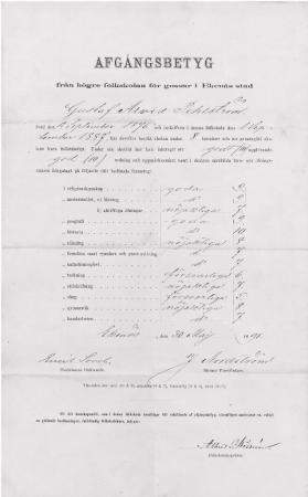 Avgångsbetyg för Gustaf Arvid Pihlström från högre folkskolan för gossar i Ekenäs stad 1891.