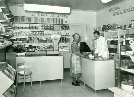 Butiksföreståndare P-O Vinberg betjänar fru Hagelberg som är Kyrkslätt Handelslags första kund då butiken öppnas 1956.