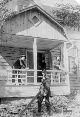 Timmermän poserar vid nybygge, Arvid Pihlström från Hindersby med borr i dörren.
