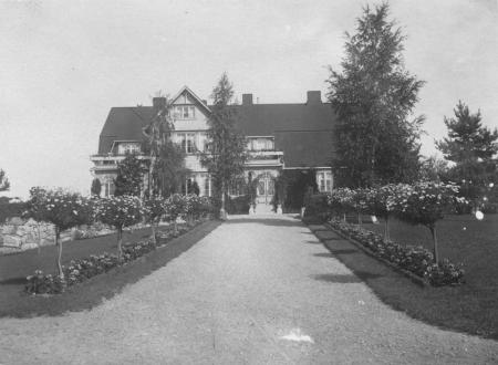 Villa Dannebrog med trädgårdsplanteringar, bred gång kantad rabatter. Bilden är tagen på 1920-talet då Elfving ägde villan.