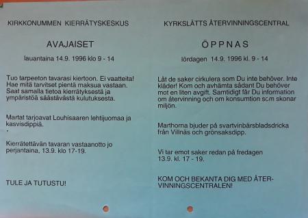 Kuvassa on mainoslehtinen Marttojen kierrätyskeskuksen avajaisista vuodelta 1996.