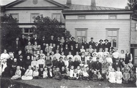 1045 Lahjoittaja: Eerikinkartanon kanslisti Inga Åvall. Mustavalkoinen ryhmäkuva Eerikinkartanon työntekijöistä perheineen päärakennuksen edessä noin vuonna 1910. Luettelo kuvan henkilöistä löytyy Björn Hedbergin kirjasta ”Eerikinkartano kautta aikojen”. Myös digitoituna.