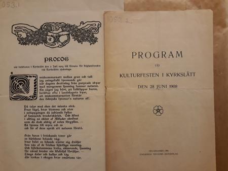 1053 Donator okänd. Två tryckalster: 1. Prolog (dikt) vid folkfesten i Kyrkslätt den 2.7.1905 till förmån för friplatsfonden vid Kyrkslätts sjukstuga. 2. Program vid kulturfesten i Kyrkslätt den 28.6.1908, inklusive prolog av Uno A. Fleege.