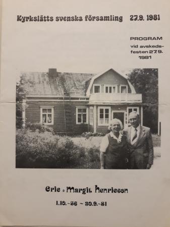 1068 Donatorer: Hilding Frostells arvingar. Tryckalster. Kyrkslätts svenska församling 27.9.1981. Program vid avskedsfesten 27.9.1981. ”eric o margit henricson 1.10.-56-30.9.-81”. Programblad för avskedsfest för långvarigt kyrkoherdepar.