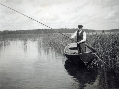 Albert Lönnberg står i sin roddbåt och fiskar med metspö på Björköfjärden.