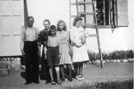 Familjen Welin utanför bostadshuset i Gillobacka på Aina Welins 50 års dag den 27 juli 1944.