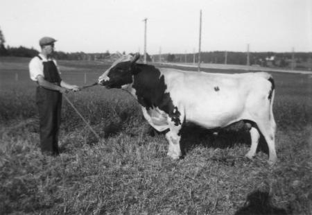 Harry Engberg med tjuren Seger på Storkvis gård.