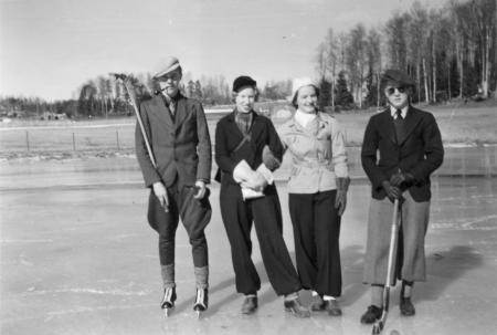 F. v. Per Engberg, Ingeborg Wilken, Hjördis Myrberg och Börje Myrberg spelar bandy på Sundet.