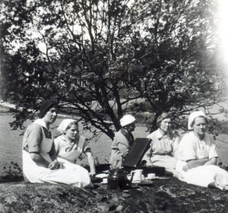 Sjuksköterskorna på Kyrkslätts sjukhus i Jolkby har paus på en kulle invid sjukhuset.