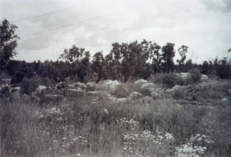 Grållas tilan tontti. Grållas gårdstomt. Valokuva on heinäkuulta 1956 sen jälkeen, kun Porkkalan vuokra-alue oli palautettu vuoden alussa. Fotografiet är från juli 1956 efter att Porkalaområdet hade återlämnats i början av året.